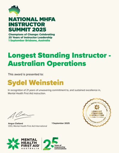 The Mental Health Station is proud to have walked this path wth MHFA Australia being in the first group to train in WA. Our Director & Lead Trainer Sydel Weinstein is grateful to have been awarded 'Longest Standing Instructor - Australian Operations' TRAINING CALENDAR